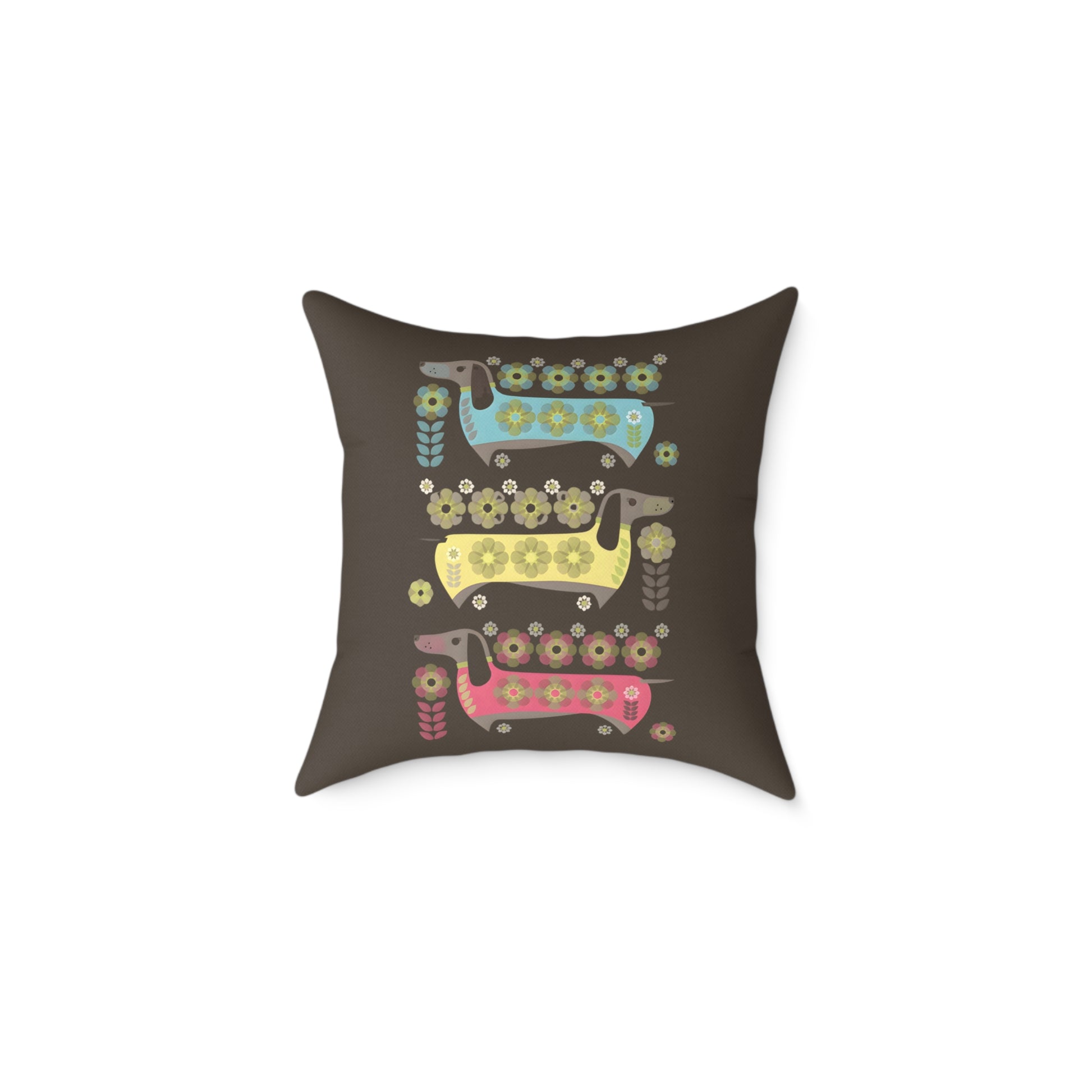 Soft, sculpted, and a little bit retro — this square 18"x18" poly canvas pillow brings playful charm to relaxed corners. Three stylized dachshunds, stacked and patterned with floral motifs in turquoise, lemon, and coral, sit against a warm brown field. The textured poly-canvas surface and foamed lining feel gentle to the touch while the sturdy polyester filling keeps the pillow plump and ready for lounging on the floor, sofa, or window seat. Double-sided printing keeps the design vivid from every angle, and a concealed zipper gives a seamless finish.